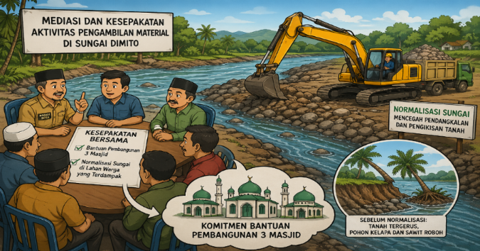 “Pihak yang mengambil material di Sungai Dimito telah melakukan mediasi yang difasilitasi oleh aparat desa, serta rapat bersama tokoh masyarakat dan pemilik lahan. Hasilnya, kami bersedia membantu pembangunan tiga masjid dan melakukan normalisasi sungai di lahan warga yang terdampak,” ujar Fajrin.